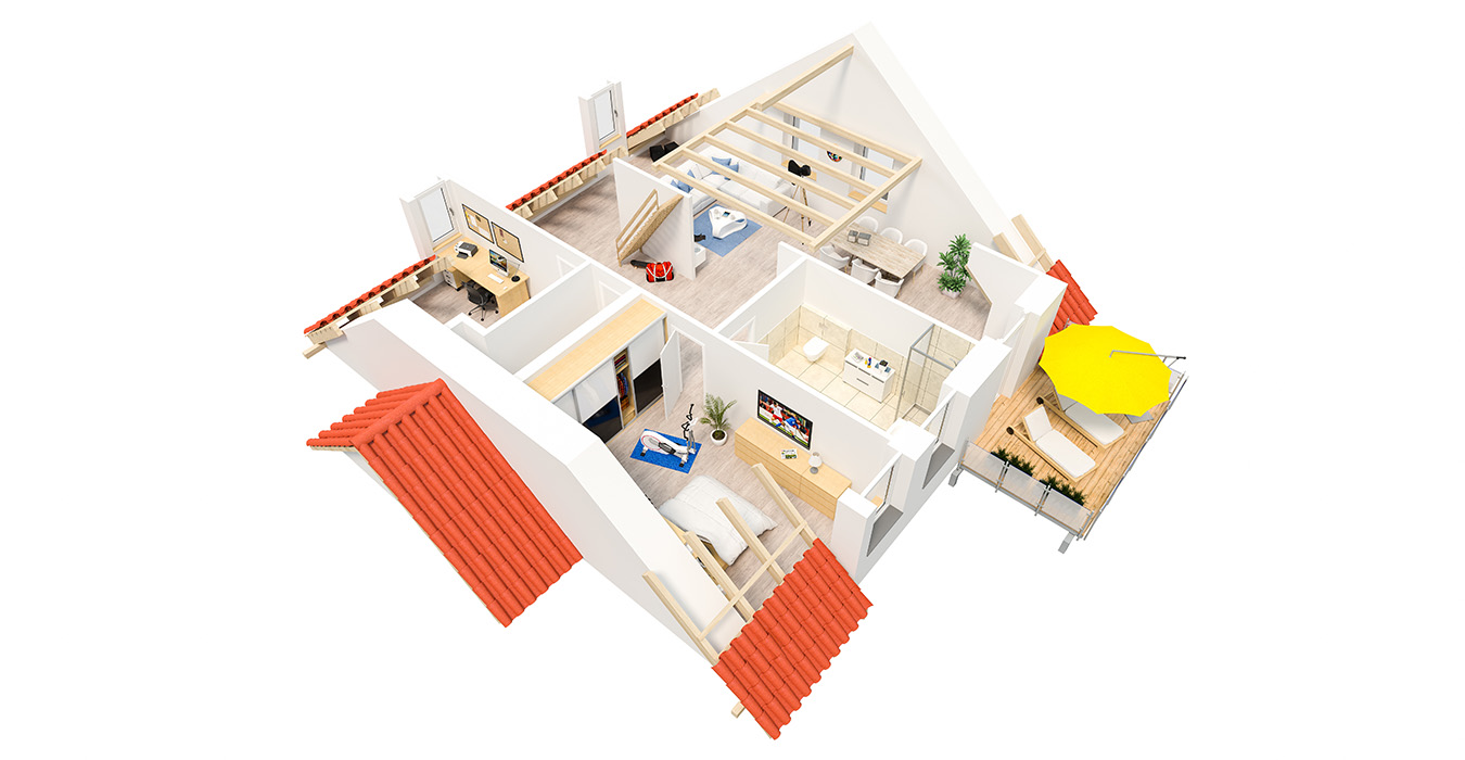 Diese fotorealistische Präsentation erleichtert die Arbeit von Architekten, Bauträgern oder Immobilienmaklern beim Verkauf eines Objektes und eignet sich für Exposé, Kataloge, Webseiten sowie soziale Medien.